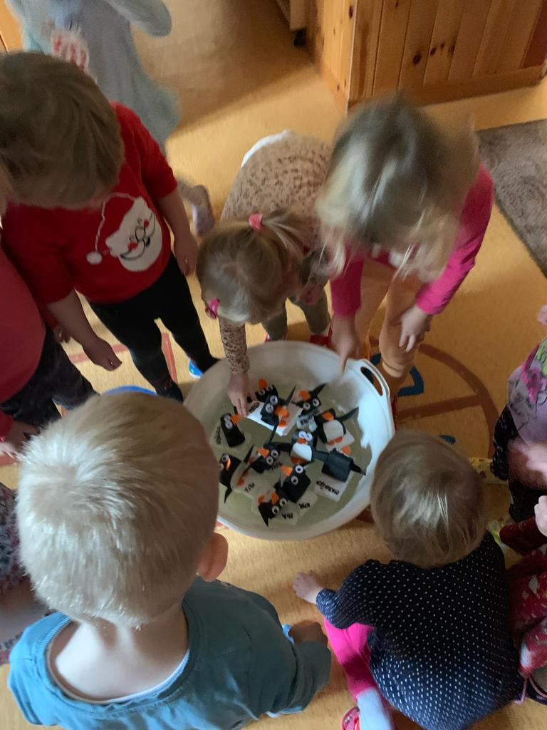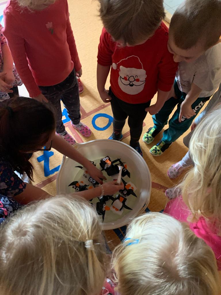 V rámci výtvarné výchovy děti vyrobily tučňáky, kteří umí plavat po vodě.